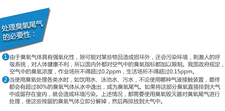從臭氧接觸池排出的尾氣中仍含有一定數(shù)量的臭氧,如果直接排入大氣,會(huì)造成大氣環(huán)境污染。臭氧尾氣的環(huán)境排放規(guī)定為0.3mg/L。